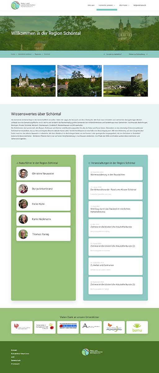 Bildbeschreibung: Webseite mit Naturführer – auf der Regionenkarte gelangt man zur Beschreibung eines bestimmten Ortes. Der Ort zeigt alle dort tätigen Naturführer und alle Veranstaltungen an. Klickt man auf eine Veranstaltung, sieht man, welcher Naturführer dort tätig ist und um welche Region es sich handelt. Geht man auf das Profil des Naturführers, erfährt man die Informationen über dessen Führungen, Regionen und Fachthemen.