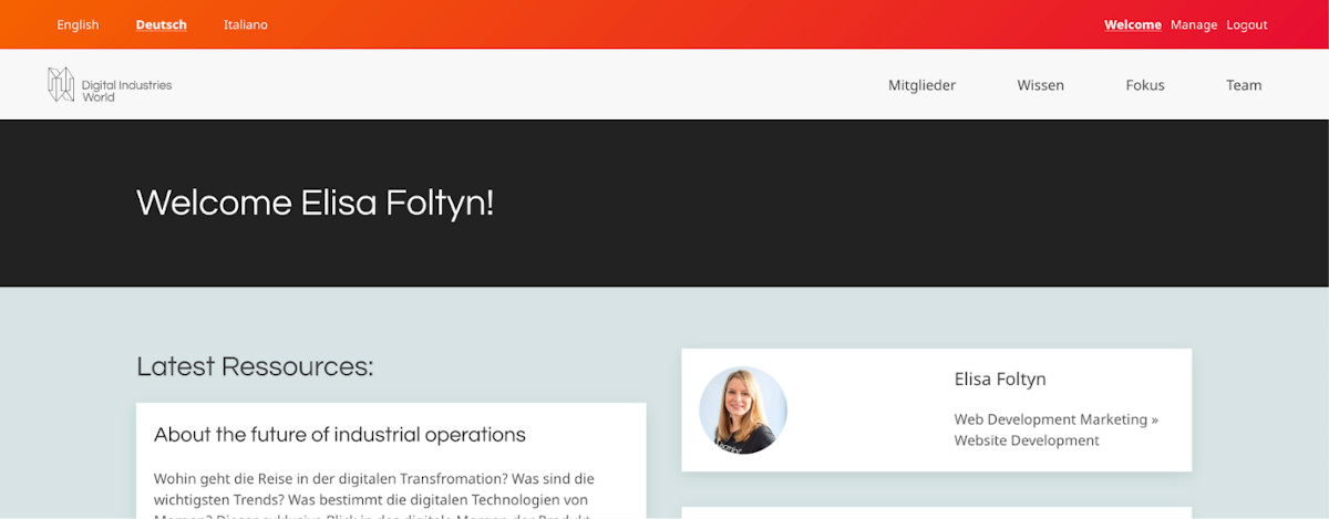 Bildbeschreibung: Im Beispiel wird gezeigt, wie ein Vereinsmitglied nach dem Login begrüßt wird. Persönliche Begrüßung, Anzeige neuester Inhalte der angegebenen Interessensgebiete und Anzeige des eigenen Profils.