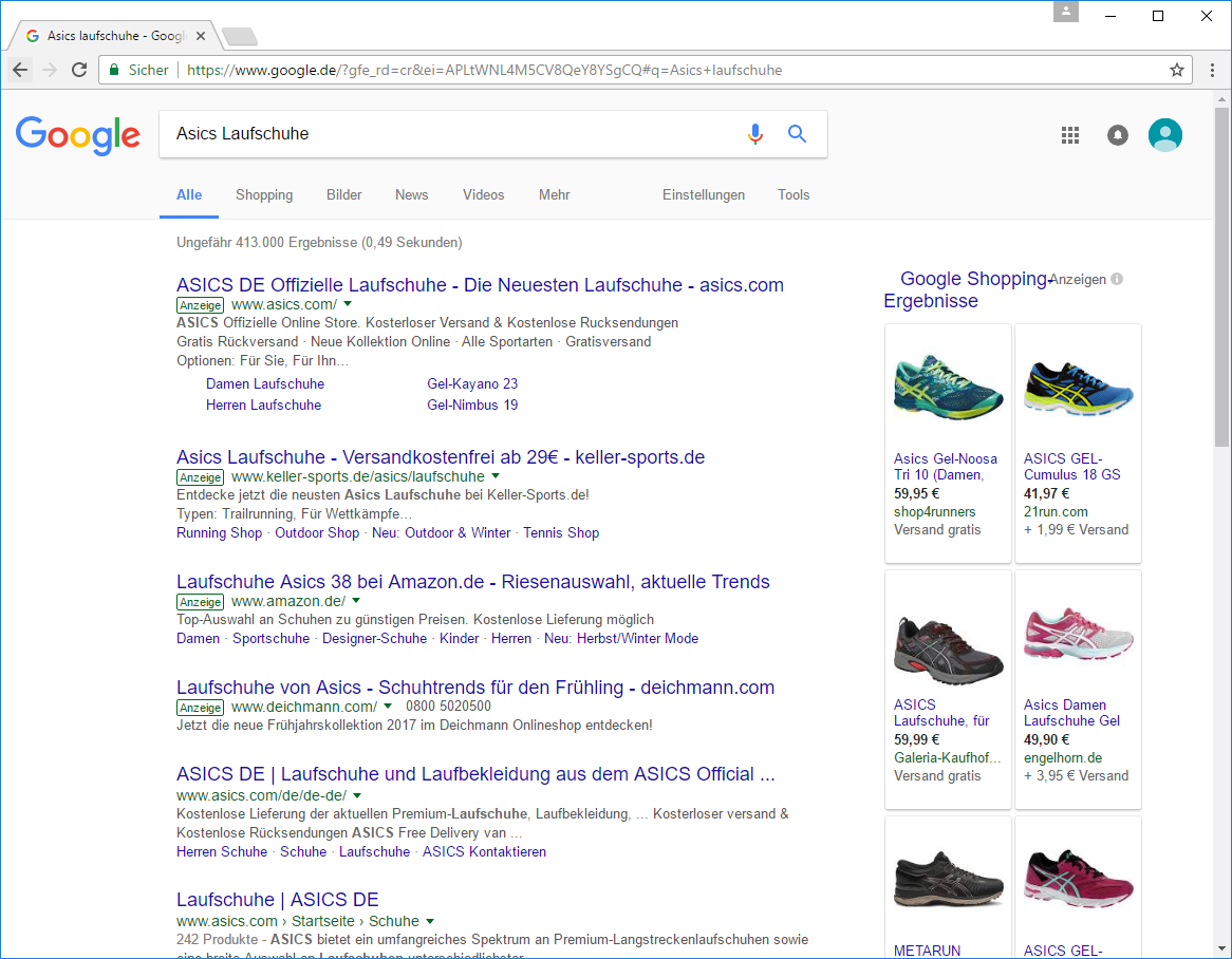 Stellen Sie sich vor, Sie möchten Laufschuhe von Asics haben. Sie suchen in Google also nach „Asics Laufschuhe“ und erhalten folgende Ergebnisse: