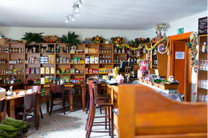 Gemeinsam schufen sie ein Ambiente zum Wohlfühlen: Der Raum ist liebevoll mit Accessoires aus Kolumbien dekoriert, an den Wänden finden sich Regale mit kolumbianischen Produkten: Aguardiente (das ist ein Schnaps aus Anis), Gewürze, kolumbianischer Kaffee und Snacks. Den zweiten Raum, in Rot gehalten, ziert ein Bild eines Bambuswaldes, wie er häufig in der typischen kolumbianischen Kaffeeregion anzutreffen ist - Frau Aguirres Heimat.