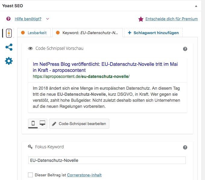 Eine weitere Möglichkeit, die Titel und Descriptions individuell zu optimieren ist, sie direkt in der Yoast-SEO-Sektion unterhalb des jeweiligen Textes zu bearbeiten.