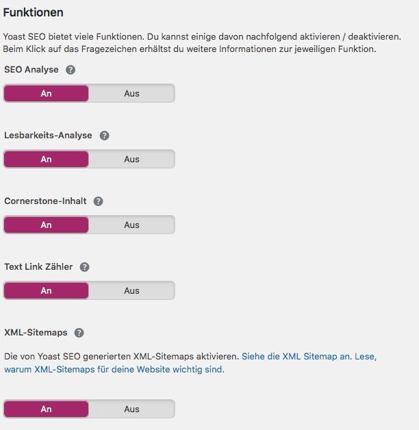 Nutzen Sie die für die XML-Sitemap Yoast SEO vorkonfigurierten Standardeinstellungen (Allgemein > Funktionen > XML-Sitemaps). Wenn Sie fortgeschritten sind, können Sie in jede einzelne Sektion klicken und bestimmen, welche Teile Sie nicht in der Sitemap haben möchten. Unser Tipp: Lassen Sie die Sitemap lieber in Ruhe, wenn Sie nicht hundertprozentig wissen, was Sie tun.